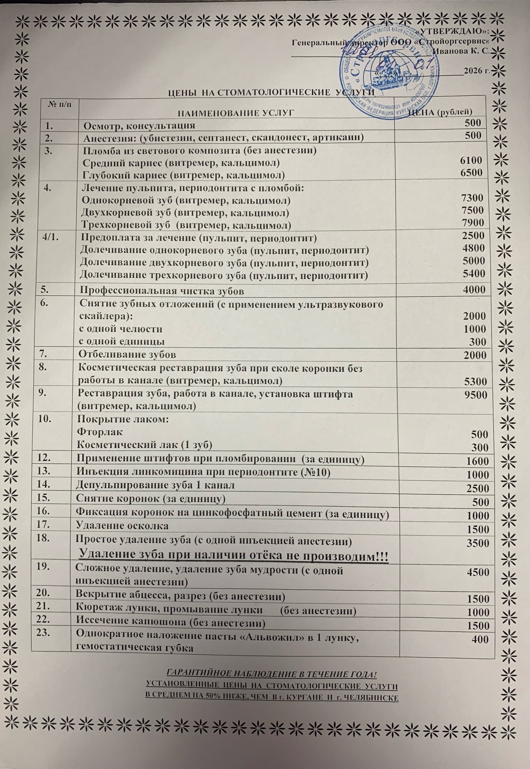 | 5. | Профессиональная чистка зубов | 4000 |